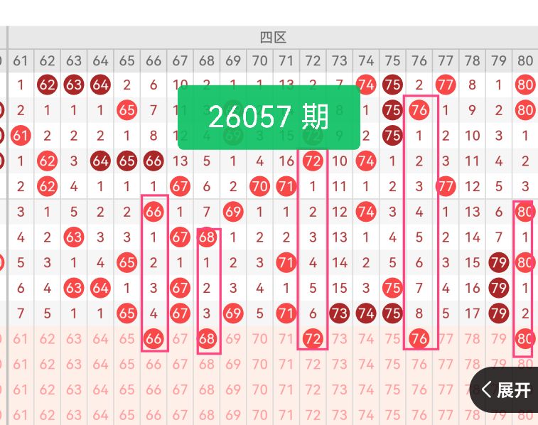 上期第四区间开奖8个号码,本期有望减少开出。66 作为四区开头号码,稳住后区起点,让大号区间起点更清晰。 68 与66形成温和组合,保持四区前段平稳,不突兀、不集中。 72 处在四区中间位置,承托整个后区重心,让大号段结构更稳固。 76 靠近四区后段,补充后半段密度,使大号分布更均衡。 80 是快乐8最大号码,作为收尾号,让整组号码完整收官,结构更完整。