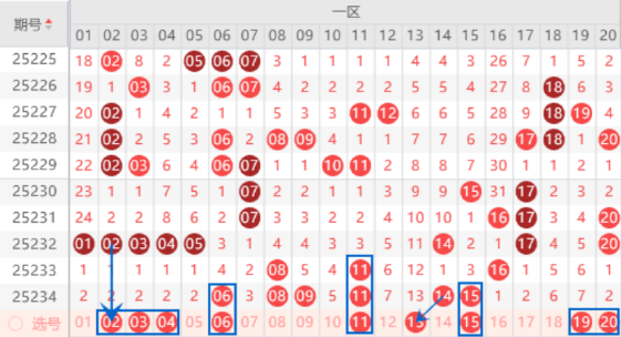 该区间的五连号01 02 03 04 05号数字,上期没能开出号码来,已经断号两期了,本期我们要注意落下号码的情况,其中的01 04 05号数字我们可以重点关注一下出号情况。该区间上期开出了06 08 09 11 14 15号数字,本期我们注意一下出重号的情况,其中的06 11 15号数字我们可以重点关注一下出号情况,本期的13号数字我们注意一下出号情况,本期可以防守一下13 15号数字同出的情况。本期的19 20号数字我们注意出一个号码的情况,其中的19号数字可以重点关注一下出号情况。