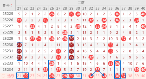 该区间的20 21 22号数字是属于重号21号数字的边号回补号码,本期我们注意出一个号码的情况,其中的22号数字我们可以关注一下出号情况。本期的28 29 30号数字是属于重号29号数字的边号回补号码,本期我们注意一下出一个号码的情况,其中的28 29号数字我们可以重点关注一下出号情况。上期开出了33号数字,本期我们注意一下走分边的情况,所以本期的32 34号数字我们注意一下出号情况。上期开出了39 40号数字,本期我们注意出一个重号的情况。