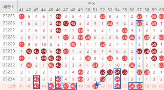 该区间的43号数字我们注意一下出重号的情况,本期的46号数字我们也是要注意出重号的情况,本期的空二中间数41 42 44 45 47 48 50 51号数字我们要注意出号情况,其中的45 48 51号数字我们可以重点关注一下出号情况。本期的52 54号数字我们注意一下出现三重号的情况,其中的54号数字可以重点关注一下。本期的57 58号数字我们注意落下一个号码的情况期,其中的57号数字可以重点关注一下,本期可以防守一下56 57号数字同出的情况。
