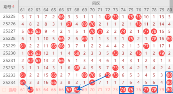 该区间的62 63号数字我们注意落下一个号码的情况,其中的62号数字我们可以重点关注一下。本期的68号数字我们注意一下出重号的情况,本期可以防守一下68 71号数字同出的情况。本期的74 75号数字我们也是要注意出一个号码的情况,其中的75号数字可以重点关注一下,本期可以防守一下74 75号数字同出的情况。本期的77 78号数字我们也是要注意出一个号码的情况,其中的78号数字可以重点关注一下出号情况。