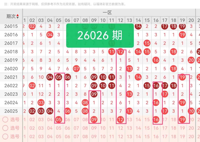 上期第一区间开奖8个号码,本期可能会减少开出。05作为区间内的中间码,兼具奇偶平衡属性,能有效衔接区间两端能量;09属于区间内的高频温号,其尾数9在近10期的一区出号中出现次数较多,符合尾数轮动规律;12作为偶数温号,刚好弥补前期一区偶数出号偏少的缺口,且处于10-15的热门出号段;16则是邻号回补的关键选择,周边号码近期频繁开出,带动其出号动能;19作为一区尾部号码,能覆盖区间末端的出号概率,与前期出号的尾部号码形成呼应。