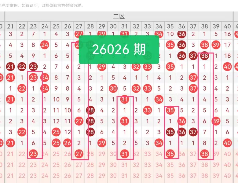 上期第二区间开奖6个号码,本期可能会减少开出。23与27均处于连号高发段,23周边的22、24近期已出现,形成了连号预热,27则延续了上一期27-28的连号热度;31作为区间内的奇数中坚号码,近10期出号节奏均匀,能平衡组合的冷热分布;35的尾数5在二区近期出号中表现活跃,且处于30-40的中后段热门区域;38作为偶数收尾号码,与31形成奇偶搭配,同时弥补了二区后期偶数出号的不足。