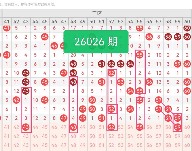 上期第三区间开奖5个号码,本期可能会稳定开出。43作为该前端号码,其奇偶属性与区间整体出号趋势契合;48属于区间内的高频温号,尾数8在近几期三区出号中反复出现,符合尾数循环规律;52处于区间中间位置,是连接前后段号码的关键,其偶数属性能平衡三区偏多的奇数出号;55作为三区的核心热门号码,近5期出号频率较高;59则覆盖了三区尾部的出号范围,与55形成前后呼应。