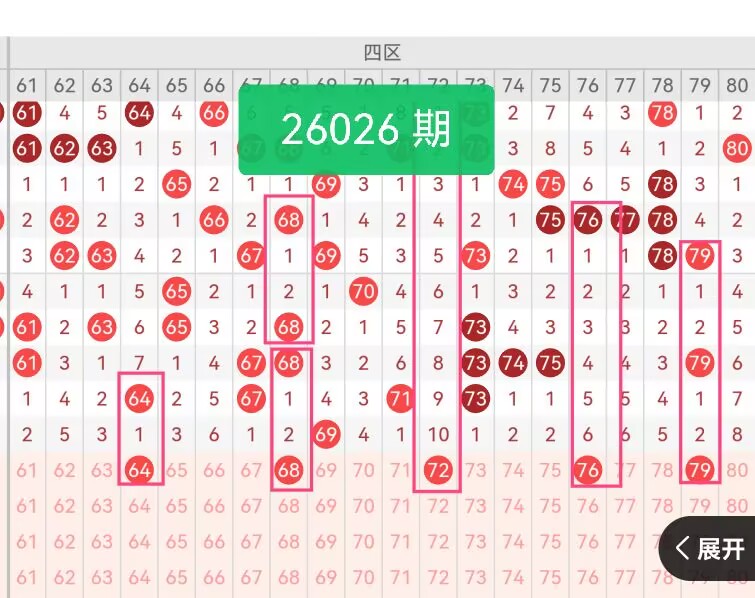 上期第四区间开奖1个号码,本期有望增加开出。64作为区间内的中前段温号,远离前期集中出号的61-63段,具备补位出号的潜力;68的尾数8在四区近期出号中表现突出,且处于65-70的过渡区域,能衔接区间前后出号;72属于四区的冷温转换号本期具备回补动能,同时其偶数属性能平衡四区偏多的奇数出号;76处于75-80的热门段,周边号码近期频繁开出,带动其出号概率提升;79作为四区尾部号码,能覆盖区间末端的出号可能性,与76形成前后搭配。
