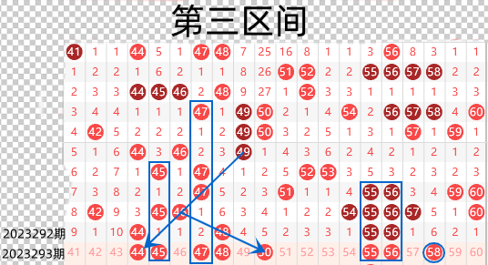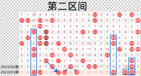 该区间的23号数字我们要注意一下,属于空二对称号码,本期的空二对称号码有好几个的,出号机会很大。本期的27 28号数字我们要注意一下,这里出一个号码的机会是很大的。本期的20 30 34号数字都是属于遗漏11期的号码,我们要注意了,这里应该是会出一个号码了,我们重点关注一下20 30的出号情况就可以了。本期的39号数字我们要注意走是三重的情况 。