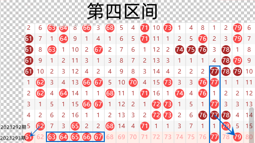 本期的61号数字我们要关注一下,防守61 67同出的情况。本期的65号数字我们要防守一下出重的情况,毕竟上次的72号数字遗漏16期开出来之后就出重了,所以本期的65号数字我们也是要防守一下的。本期的66 67我们要注意落下一个号码的情况,重点考虑一下67落下来的可能情况。本期的77号数字我们要做一下防守,属于空一对称号码,79号数字也是可以关注一下的,最近这里的三斜连出的有点频繁了。