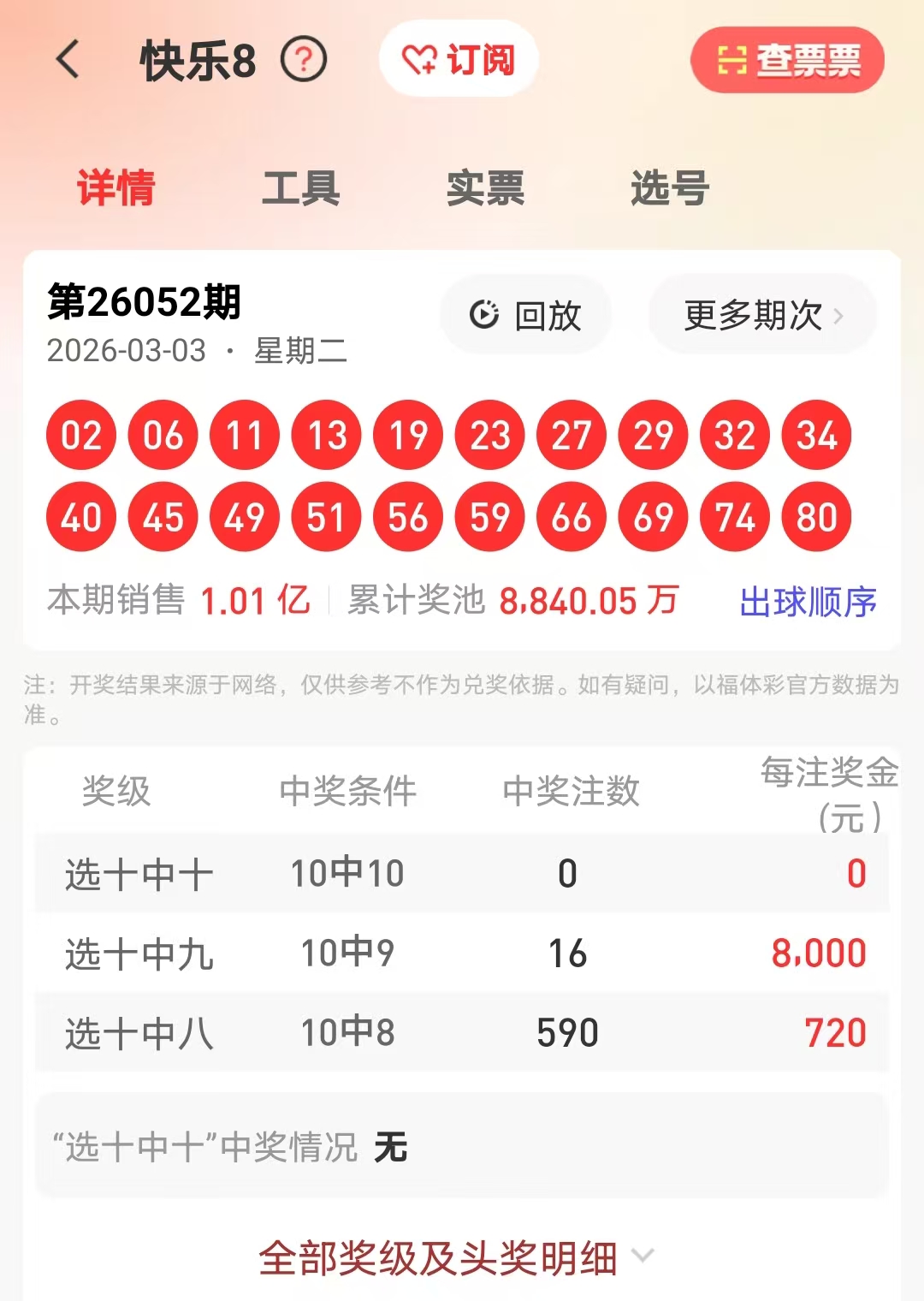 26050期命中9码 25,34,43,58,62,64,65,72,74