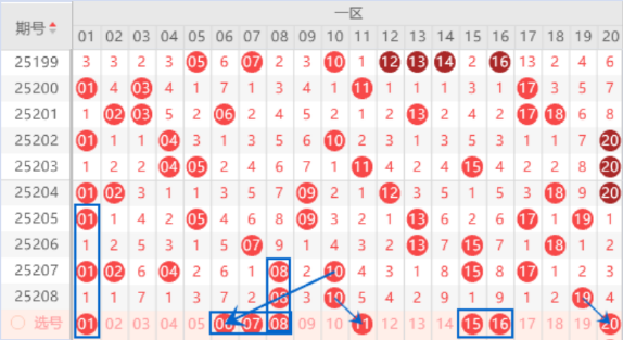 该区间的连号空一带号01 02 04号数字上期没能开出重号来,本期我们注意一下出一个号码的情况,其中的01 02号数字可以重点关注一下出一个号码的情况。上期开出了08 10号数字的重号,本期我们注意一下出一个三重号码的情况,其中的08号数字可以重点关注一下出号情况。本期的11号数字我们注意一下出号情况,本期可以防守一下08 11号数字同出的情况。本期的15 16号数字我们注意出一个号码的情况,其中的15号数字可以重点关注一下。