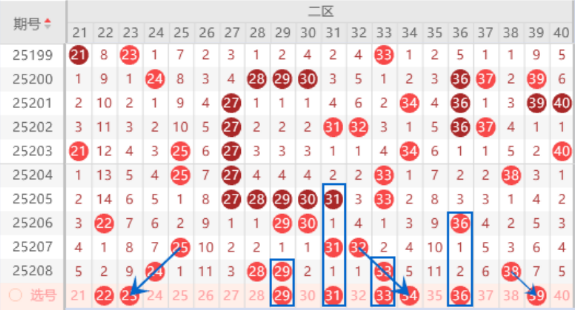 该区间的23号数字是属于斜三连走势号码,本期是有出号机会的,我们可以防守一下22 23号数字同出的情况。上期开出了28 29号数字,本期我们注意出一个重号的情况,本期的26 31号数字都是属于空三中心号码,本期我们注意出一个号码的情况,本期可以防守一下28 31号数字同出的情况。本期的34号数字是属于三斜连号码,本期出号机会也是有的,我们可以防守一下26 34号数字同出的情况。上期开出了38号数字,本期我们注意一下39 40号数字出一个号码的情况。