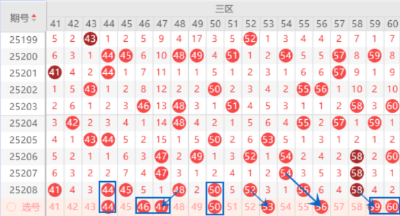该区间上期开出了41 44 45 48 50 52 55 58号数字,本期我们注意一下出重号的情况,其中的44 45 50 55号数字我们注意一下出重号的情况,本期是有机会出2个重号的情况。本期的42 43 46 47号数字也是要注意出号情况,其中的46 47号数字可以重点关注一下出号情况。本期的51号数字我们注意一下出号情况,本期可以防守一下50 51号数字同出的情况。本期的53 54 56 57号数字我们也是要注意出号情况,其中的53 56号数字可以重点关注一下出号情况。