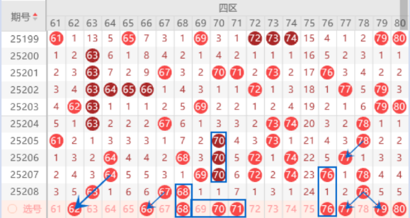 该区间的62号数字是属于三斜连号码,出号机会是有的,我们可以重点关注一下出号情况。本期的65 66号数字本期注意落下一个号码的情况。上期开出了67 68号数字,本期我们注意一下出一个重号的情况,其中的68号数字可以重点关注一下出号情况。本期的69 70 71号数字是属于重号70号数字边号回补号码,本期我们注意一下出一个号码的情况,其中的70 71号数字可以重点关注一下。本期的79 80号数字我们注意一下出号情况,其中的79号数字可以重点关注一下。