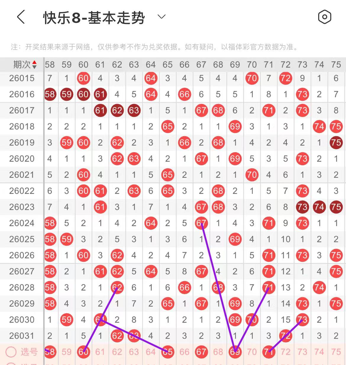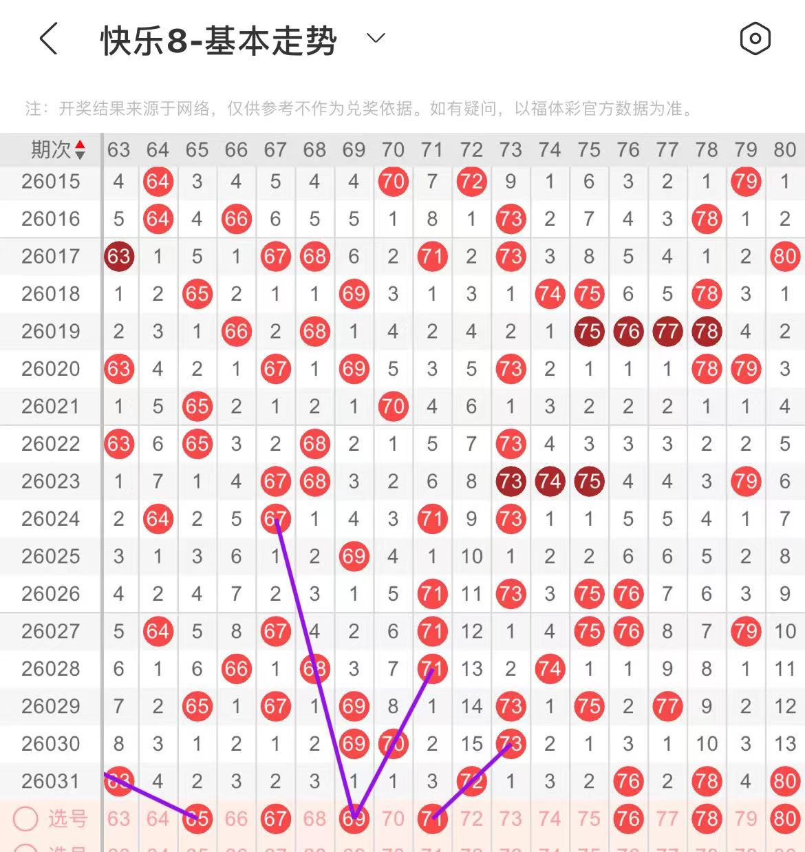 61-70区:本区间上期开出了两个号码,从号码走势图上看,该区现属于温热区,本期重点关注奇数号码回补,出号个数在三个号码左右,有出号走势的号码有65号,斜连出号走势,防65.67同出的可能,69号,双线斜连出号走势。