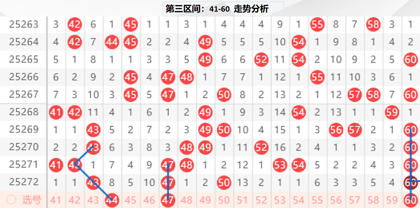 三区分析:【41-60】(走势图标注号码非小黄车大底,请谨慎参考,具体思路将在直播间分享讨论)