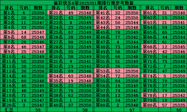 最后再把号码分为四区:一区01-20号、二区21-40号、三区41-60号、四区61-80号,理论上每个区每期应该开出5个号码:
