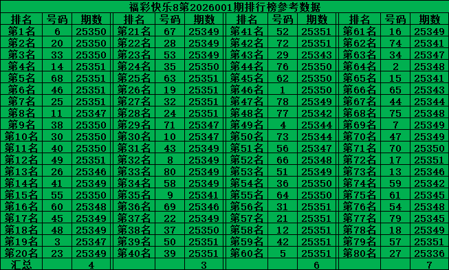 综上所述,福彩快乐8第2026001期推荐号码: