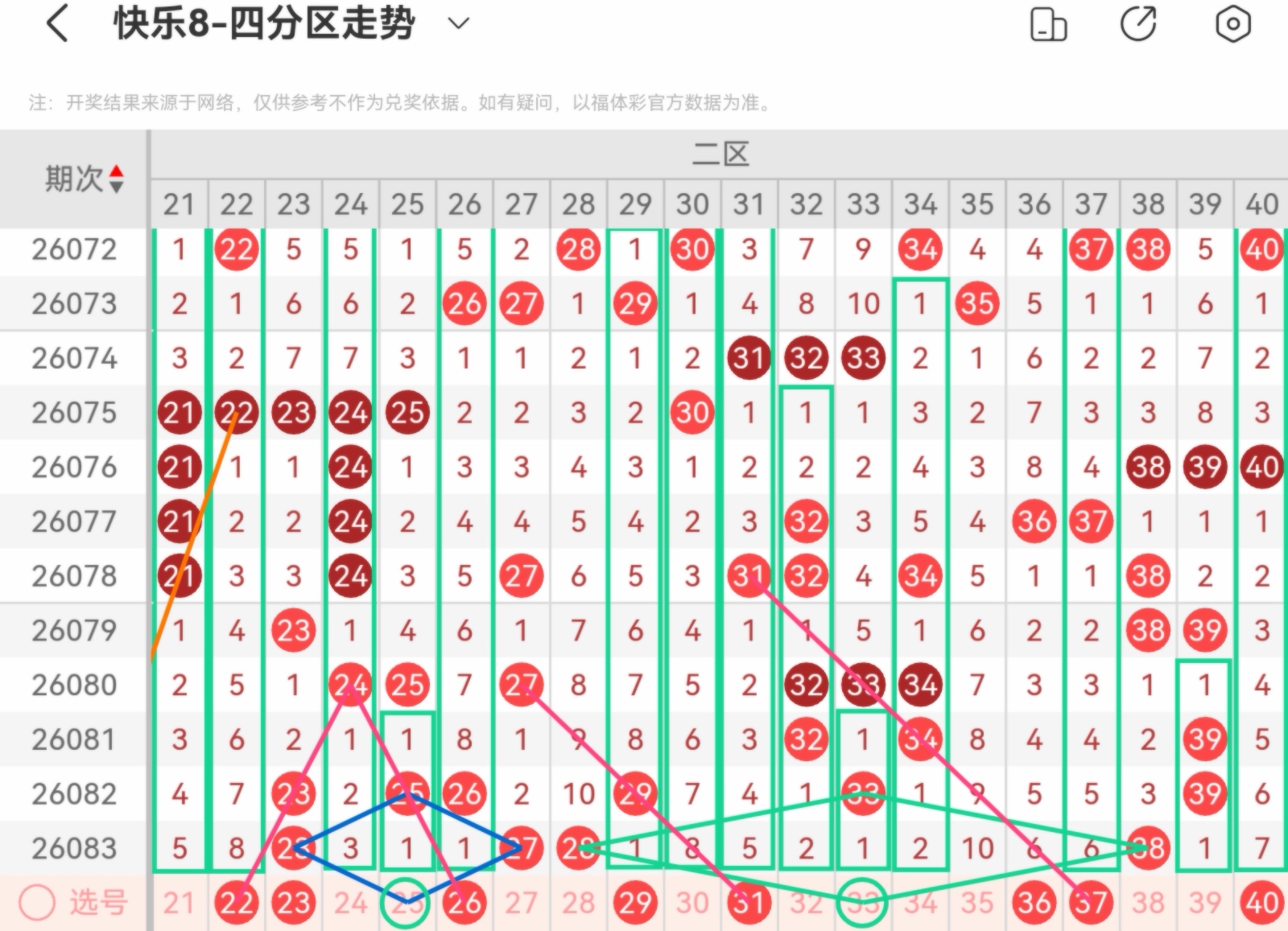 大家好,我是甜丝丝的坏事,主要以快乐八的形态走势、空位走势、遗漏走势以及斜连走势相结合的方法,用公认的四走势来进行预测分析,希望能让你有所收获。