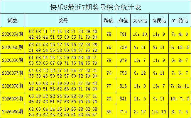 福彩快乐8第2026060期开出奖号:02 03 04 14 15 19 25 28 32 38 39 40 42 45 48 60 61 63 65 67,其中奖号跨度为65,和值为710,大小比为8:12,奇偶比为10:10,012路比为8:7:5。