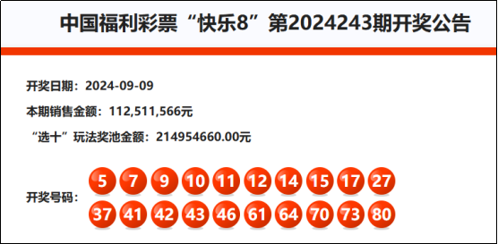 首先我们先来回顾快乐8第2024243期开奖号码:
