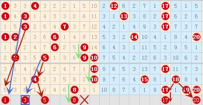 在上图中1-10号数字区间近三期出号个比为1:2:1,看着有点冷了,按照3个周期未一轮来算,本期应该是要开出2个及以上号码的。可以在这个区间作手布防一下。11-20号数字这个小区间从上图来看有转热的趋势,不知道这是不是个陷阱,要慎重思考。