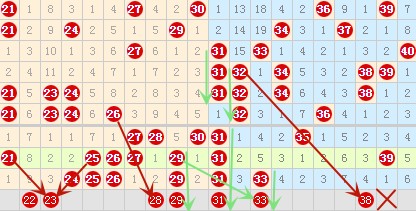 在上期中,本区域开出了4个重号,那么本期应该是还有重号的,可以从考虑重号下手。在21-30号数字区间上期中的24 25 26与上上期的25 26 27这种重叠号类型是不是很眼熟,按照前面的相似性,24 25 26号数字这个3连号下面可以防着了,这里慎重选号或者直接放弃。31-40号数字区间有转冷趋势,建议少选号为主。