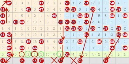 上图中41-60号数字区间上期开出2个号码,出现了反弹现象,本期应该会回到正常现象,开出4-5个号码。51-60号数字区间已经由热转冷,尽量避免该区域选号,等该区域有转热趋势我们在作布防。重点应该放在41-50号数字这个小区间,但是经过研究,本区域也不好分析,所以建议本区域的选号作为防守号要好一点。
