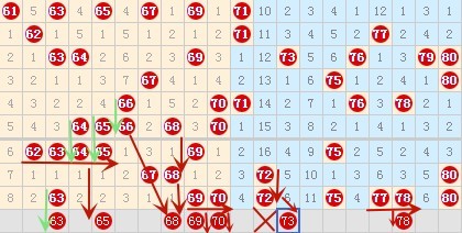 在上图中62 63 64 65号数字这个4连号在上期落了一个号码,那么本期应该也是要落号的,可以重点考虑。上图中69 70 72号数字这种类型的组合近期开出重叠号的情况有点频繁,本期该种类型的有三组,所以的防一组出现类似的情况。在71-80号数字区间上期开出了5个号码,虽然与我上上期分析的晚来了一步,但始终还是跟上来了,既然上期开出了5个号码,那么本期应该是要出现重号的,可以从这方面下手。好了,本期分析就到这了。