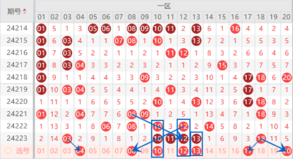 上期开出了03号数字,本期03号数字走重的机会不是很大,所以走分边的情况是很大的,我们重点关注一下04号数字的出号情况,本期的02号数字是属于冷号,本期出号机会不是很大。上期开出了4连号10 11 12 13号数字,本期我们注意出重号的情况,其中的10 12号数字我们注意一下出一个重号的情况,本期的13号数字也是要注意出重的情况,毕竟上期开出了03 13号数字,本期应该是有机会出一个重号的。