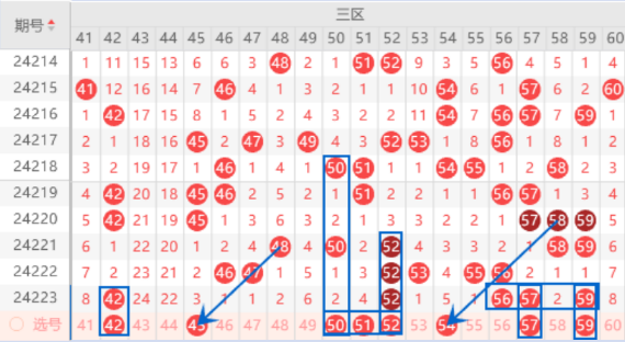 上期开出了35 52号数字的三重号码,根据最近的走势来看,出现4重号的情况是比较频繁的,所以本期我们要注意出现4重号的情况,其中的52号数字出现4重号码的机会是比较大的,我们要重点关注一下。上期开出了56 57 59号数字,属于连号空一带号类型,本期我们注意出重号的情况,重点关注一下57 59号数字出一个重号的情况就行了。