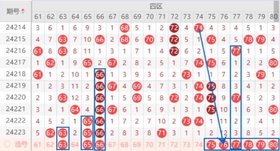上期开出了62 63 65 66号数字的2连号码。本期我们注意一下出重号的情况,其中的65号数字可以重点关注一下,本期是属于三重号,最近开出的3重号也是比较频繁的,我们可以重点关注一下,本期的66号数字我们防守一下出现7重号的情况。本期的75号数字我们注意一下出号情况,本期的75号数字是属于大长斜连号码,也是带号关系号码,出号机会很大,我们可以重点关注一下。