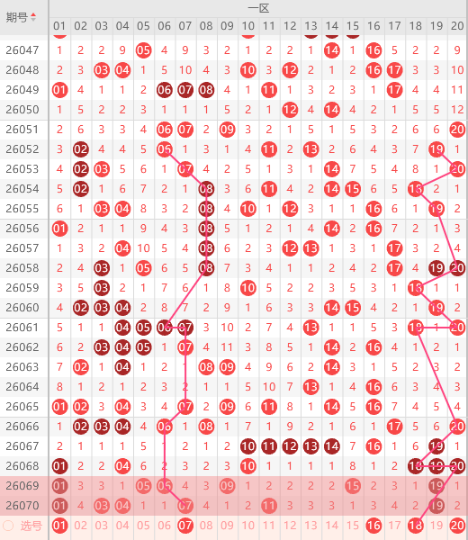第一区间的走势分析:第一区间上期开出了6个号码球,主要的落号点位在一区间7号位,走出了四奇的形态走势,上期一区间的落下了六个号码球整个一区间处于走热的趋势,根据一区间的走势规律,今天的一区间我们主看07的重码,走出了斜称的走势形态,再看后半区18、20对称的回补,落下一码的机会很大,这三个号球重点关注07、20的组合以及18-20的组合,防守07、18、20组合的落位,建议大家打个三胆拖,或者打个三码复二比较稳妥,参考为主!