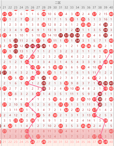 第二区间的走势分析:第二区间上期开出了四个号码球,属于前半区与后半区各出2个,属于比较平稳的走势,根据二区间的走势规律,今天的二区间我们主看前半区26的回补,走出了上下对称的走势形态,再看二区间前区位置25-27这三个号码球的落位,重点关注26 28组合以及38-39的组合。
