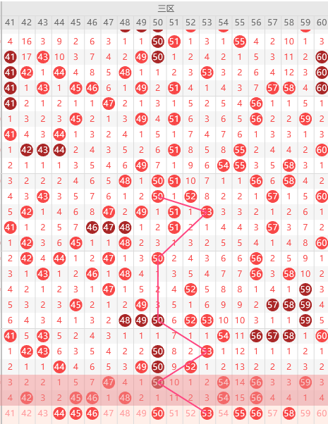 第三区间的走势分析:第三区间上期开出了六个号码球,主要的落号点位在三区间的前半区,走出了一奇三偶的形态走势,上期三区间的前半区落下了四个号码球,后半区落下了二个号码球,整个三区间处于走热的趋势,根据三区间的走势规律,今天的三区间我们主看后半区龙头位置50-53组合的落位,50属于热码的走势,53走出了连期对称的走势,最后关注45这个号码球的落位。