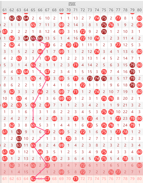 第四区间(61-80)第四区间的走势分析:第四区间上期开出了四个号码球,主要的落号点位在四区间的后区,走出了一奇二偶的形态走势,上期四区间的前半区落下了一个号码球,后半区落下了三个号码球,整个四区间处于平稳的趋势,根据四区间的走势规律,今天的四区间我们主看前半区65 这个号码球的落位,65走出了斜连码的走势,重点关注65-67组合