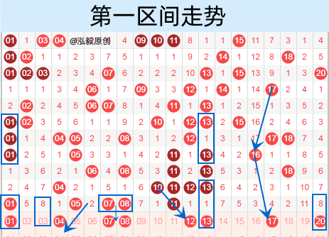该区间上期开出了01号数字,那么本期我们要注意一下01号出重号的可能了。03 20号都是属于遗漏8期的号码,那么本期我们要注意开出一码的情况了。连号空一带号05 07 08号我们也是要注意落重号的情况。4连号10 11 12 13上期落下来了11号的重号,那么本期我们就要注意10 12 13号的落号情况了,当然也是要防守一下11号出5重号的可能的。