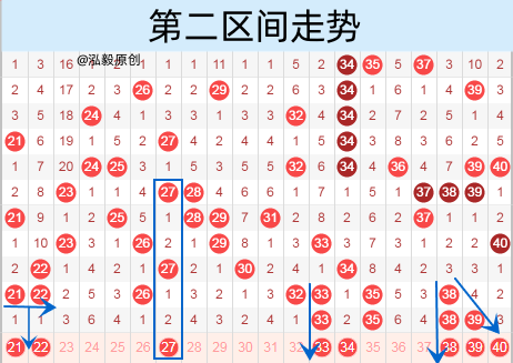 该区间上期从11-33号直接断号了,本期我们要注意一下该断号区间本期应该没有多少号码开出来,谨慎做号。连号21 22号上期没能落号下来,本期我们要防守一下落号下来的情况。24号我们可以防守一下,它是2斜连空一对称号码,这种类型的号码开出的也多。上期连号空一带号32 33 35开出了33 35两个重号,那么本期我们要注意一下出3重号的情况。38 39号这里我们要注意一下三角杀的可能了。