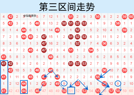 该区间的三斜连号44 45 46我们要注意44号出重号的可那个,这里的4斜连号43太危险了,能放弃还是放弃吧。该区间的47 49号的出号方式和前面的33 35有点类似,我们要防守一下这里的48 49连坐的可能。上期三连号51 52 53号落下了52,拿么本期的51 53落下一个号码就很正常了,我们要抓一抓的。