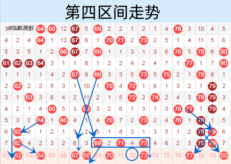 该区间的62号我们我们要注意出三重的情况,机会还是很大的。67 69以68为中心形成对称上期落下了69号,那么本期我们就要注意67号的出号情况了。。上期开出的69 71 73这种3连空一带号的组合,那么本期我们就看一重号和一夹号就可以了。