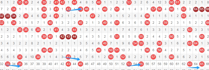 上图是福彩快乐8开奖号码走势分布图其中一部分,我在上面走势图中标注出来的数字都是3尾数数字和5尾数数字组成的跨度二组合,分别是3335 4345 5355 6365一共有4组,这4组跨度二组合已经连续遗漏了7期,上次开出的跨度二组合是上面标注出来的横向蓝色小箭头4345,那么本期关注这些组合出一组或者两组,个人最看好5355 6365。