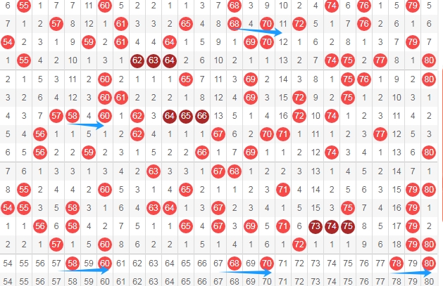 上图是福彩快乐8开奖号码走势分布图其中一部分,我在上面走势图中标注出来的数字都是8尾数数字和0尾数数字组成的跨度二组合,分别是5860 6870 7880一共有3组,这3组跨度二组合已经连续遗漏了7期,上次开出的跨度二组合是上面标注出来的横向蓝色小箭头5860,那么本期关注这些组合出一组或者两组,个人最看好7880 6870。