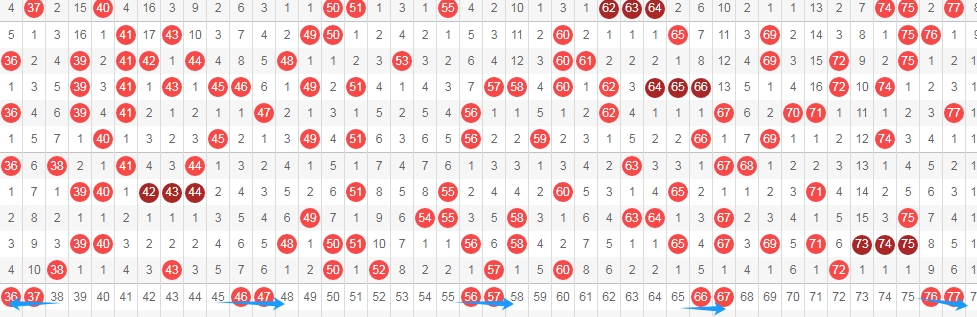 上图是福彩快乐8开奖号码走势分布图其中一部分,我在上面走势图中标注出来的数字都是6尾数数字和7尾数数字组成的连号组合,分别是3637 4647 5657 6667 7677一共有5组,这些连号组合最近都没出现过,那么本期可以关注这些组合出一组或两组,个人最看好3637 7677 4647。