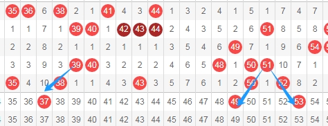 上图是福彩快乐8开奖号码走势分布图其中一部分,我在上面走势图中标注出来的数字37 49 53这三个数字都是斜连号码,数字37是从数字39一直斜连下来,数字49一直从数字51斜连下来,数字53一直从数字51斜连下来,那么本期这3个数字,你们看好不?