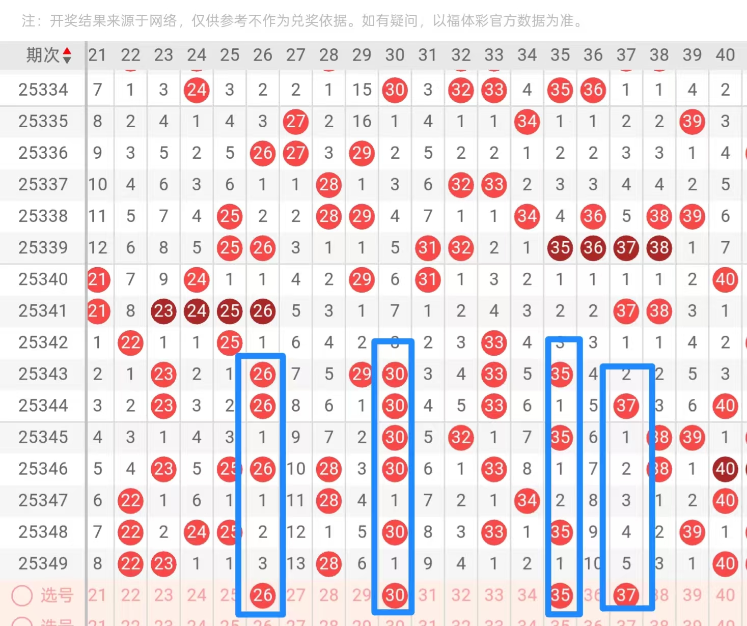 二区21—40:二区上一期在龙头位置20 2同时走了三重,本期来说离他们上面有一个突破四重的概率比较大,但是风险也较高,在这个思路点位上,如果说再去选择的点的话,还是去考虑二五,二六,27这一块的出号明显的特征比较好的,尽量还是空一空三的,26像他组合的话就搭配30,值得注意的是在3字头整体是处于一个近期出号少的频率的范畴之内,那么在这个形态上面建议大家还是少,但号码能看到的组合就是30 35