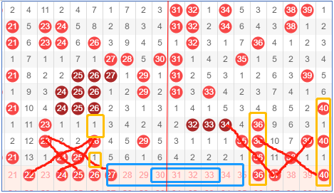 第二区间号码21-40,二区在目前这个走势下还能保持区间开奖五个数,真的是够坚持的。这也是我们一直看好他的原因。下一期二区中间区域空出,是不是会回堵,需要我们注意一下。但是随着号码24 25的开出,似乎是27 25 26 27又再一次想要走出来,你觉得呢?