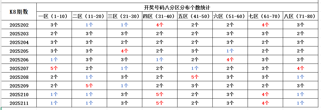 如图,红色字体是热号区,区间开出4个及以上号码。蓝色字体是冷号区,区间开出1个及以下号码。以近10期为一个分析周期,依据久热必冷,久冷必热的规律,本期重点关注:四区、七区,区间可能开出3-4个号码。一区、二区、八区,区间可能开出1-2个号码。个人分析,仅供参考。
