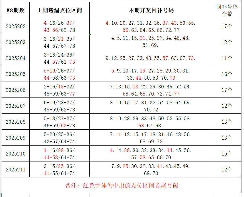 如图,上期的遗漏号码在下期开出10个左右,即为回补号码。定准点位区间首尾号码是关键!以上期2025211期(会员专区数据)为例,定位4个遗漏区间,围中12码!结合上期开奖号码,以跨度值大于或等于7为依据,本期关注3个遗漏区间:9-20/49-69/70-77;重点关注遗漏-区间:****(会员专区可见),区间遗漏号码可能在本期回补开出。注意区分遗漏区间回补号码和大底号码,不要混淆。个人分析,仅供参考。