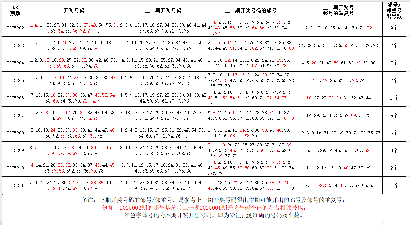 如图,红色字体是上期邻号、邻重号在下期开出,每期开出10个左右。上期邻号开出7个,邻重号开出3个。本期参考邻号:6.10.19.21.23.26.29.34.36.46.48.50.68.71.76.78.79;邻重号:8.24.25.31.32.33.37.38.39.40.41.42.44.69.70;个人分析,仅供参考。