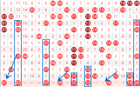 该区间的03 04本期我们要注意落下号码的情况,重点考虑一下03号数字的出号情况。本期的07 09我们要注意一下,出一个号码的情况还是有的。本期的11 13 14 15会不会复制34 36 37 38呢?我们要防守一下的。上期开出了17 19号数字,本期我们要注意走重和分边的情况。