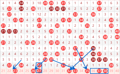本期的23号数字我们可以关注一下,毕竟上期连号22 23落下了22号数字,那么本期落下23号数字的机会就很大了。本期的31号数字我们要注意走重的情况。32 33也是要注意落下一个号码的情况。三连号36 37 38本期我们可以防守一下落下一个号码的情况。
