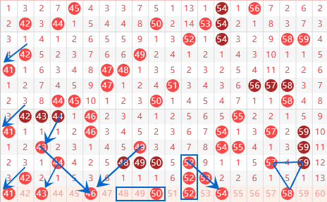 本期的41号数字很好,但是出号就不一定出了,我们做一下防守就行了。三连号48 49 50我们要注意落号的可能了,前面的三连号36 37 38我们做防守,这里的的48 49 50落号我们就要做号了,也可以在这里定一个胆码。本期的54号数字我们可以防守一下,52 53同出的情况,大多数时候都是带54的。